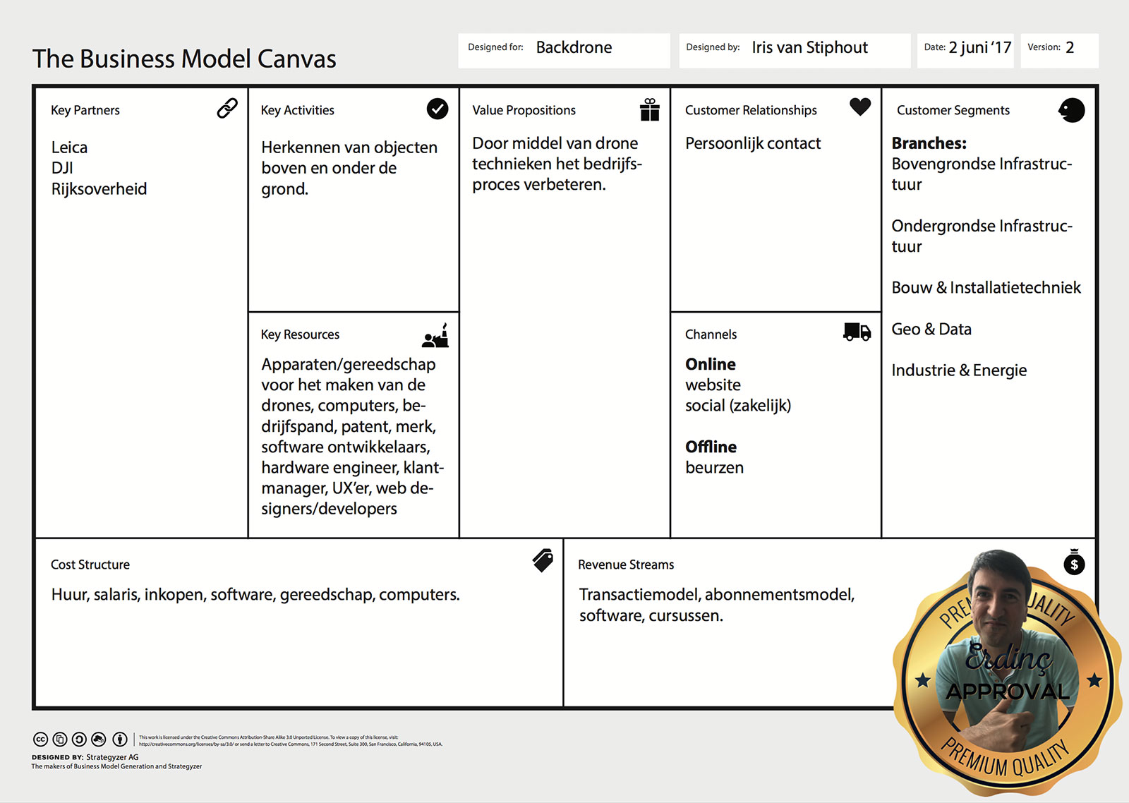 Om ons concept in de markt te zetten heb ik dit model d.m.v. onderzoek in kunnen vullen. Zo heb ik bijvoorbeeld gekeken welke betrokken partijen er zijn met wie we samen kunnen werken. In ons geval is dat Leica (ontwikkeld nauwkeurige meetapparatuur), DJI (een van de grootste drone-fabrikanten) en de Rijksoverheid voor de certificaten en vergunningen.