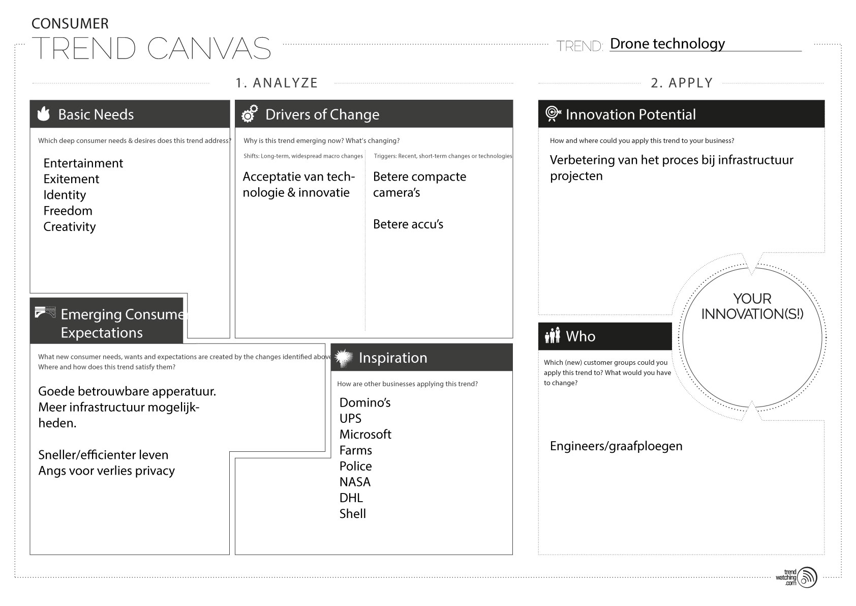 Aan de hand van bovenstaand verslag heb ik ook een consumer trend canvas ingevuld om te de trend te begrijpen en toe te passen. Na het invullen van het canvas zie ik dat er veel potentie ligt om hier iets mee te doen binnen de infrastructuur. Daarom hebben we er als groep voor gekozen om tijdens dit project iets met deze trend te doen.