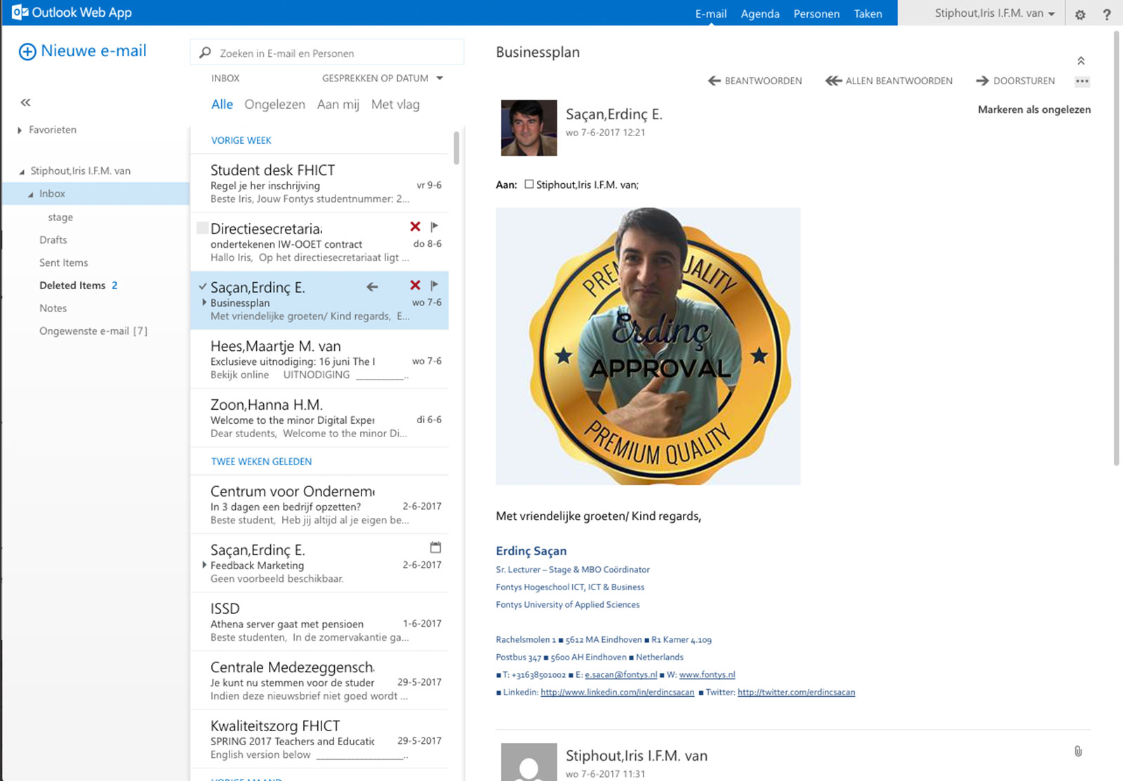 In een persoonlijk gesprek met Erdinç hebben we samen het business canvas model nog even goed nagekeken waarna ik een paar kleine aanpassingen moest maken. Hierna heb ik via de mail de laatste versie verstuurd. Zoals afgesproken had ik een “Erdinç approval” sticker gemaakt die hij als antwoord terug stuurde. Dit geeft dus aan dat het business model canvas correct is toegepast op het project.